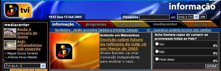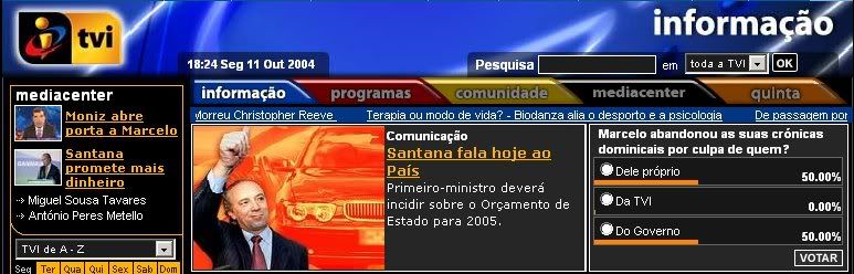 Existe uma sondagem no site da TVI sobre a culpabilidade de Marcelo Rebelo de Sousa ter saído da TVI. A hipótese "TVI" mantem-se sempre a 0,00%
